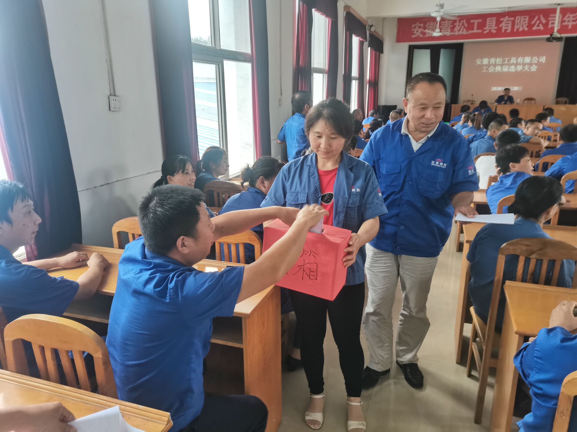 2020年7月28日,公司工會在大會議室召開會員大會,會議由第二屆工會主席劉曉峰同志主持,會上儲 哲同志宣讀了選舉辦法,全體會員以舉手表決的方式通過選舉辦法和總監(jiān)票人名單,并以無記名投票的方式選舉產(chǎn)生了第三屆工會委員會,選舉王曉建同志為主席,儲 哲、儲成鳳、儲德江、陳尊岳四同志為委員。